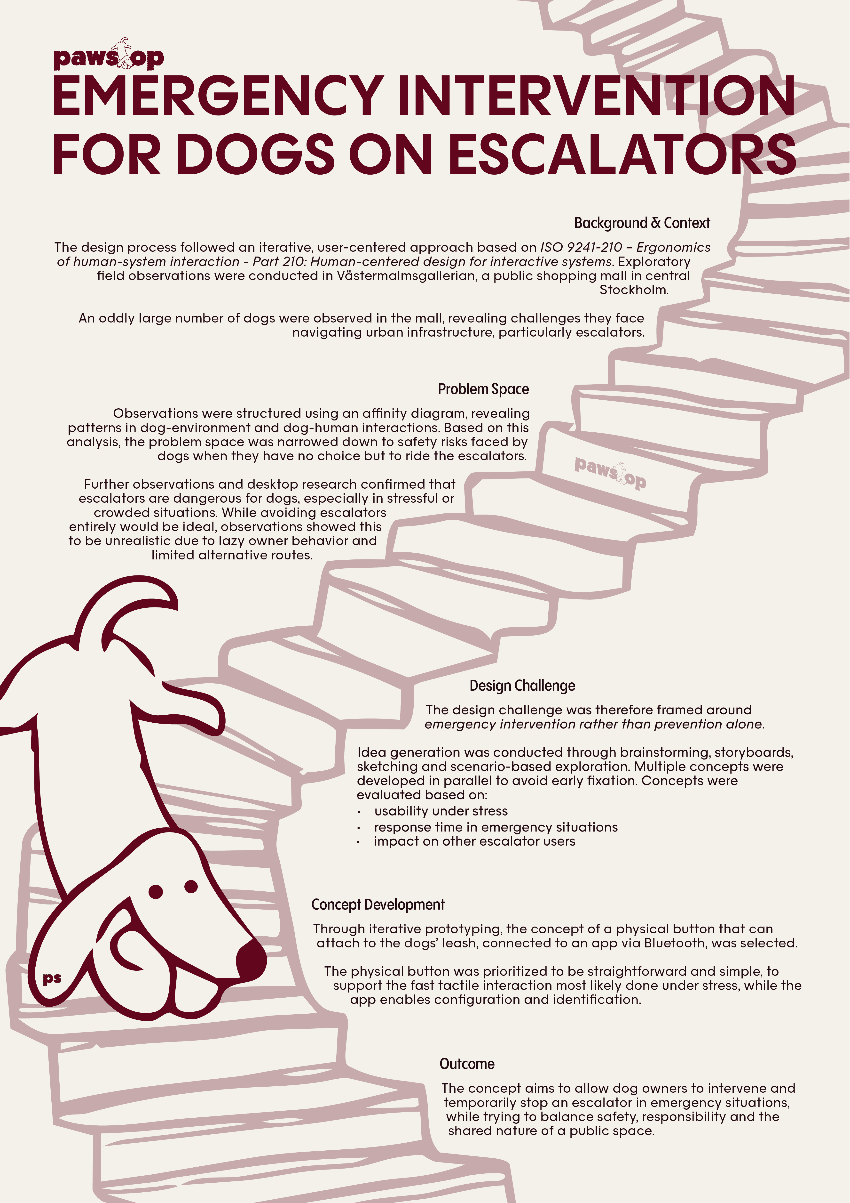 The design process resulted in a two-part solution, a physical emergency stop button that attaches to the dogs leash. In combination with a mobile application made to pair the physical button and identify the user in case of misuse. It also provides information such as the nearest veterinary hospital, common escalator-related dog injuries, and a backup emergency stop.
