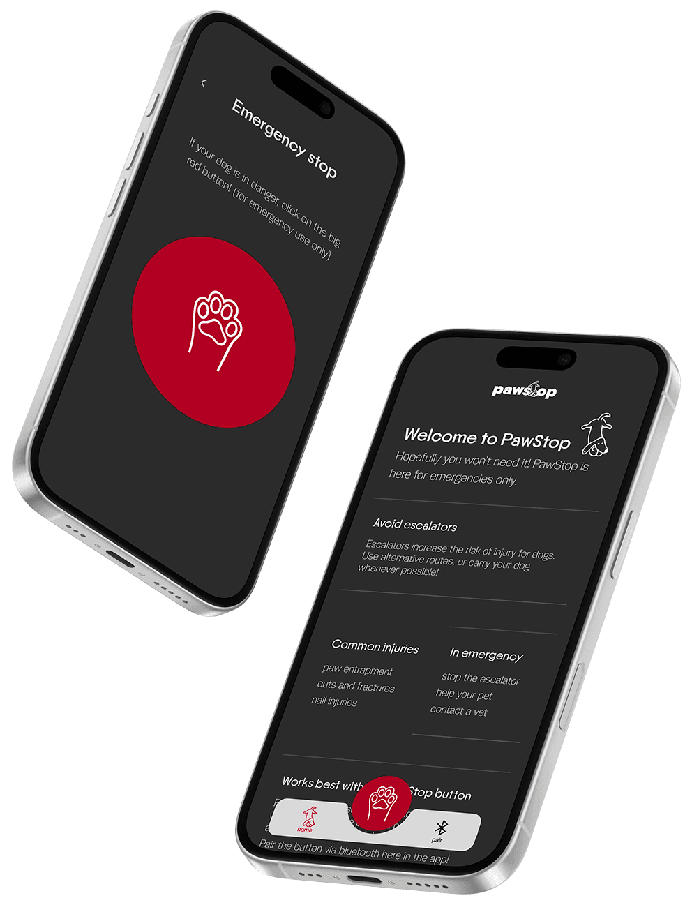 Made to pair the physical button and identify the user in case of misuse. The app also provides information such as the nearest veterinary hospital, common escalator-related dog injuries, and a backup emergency stop.